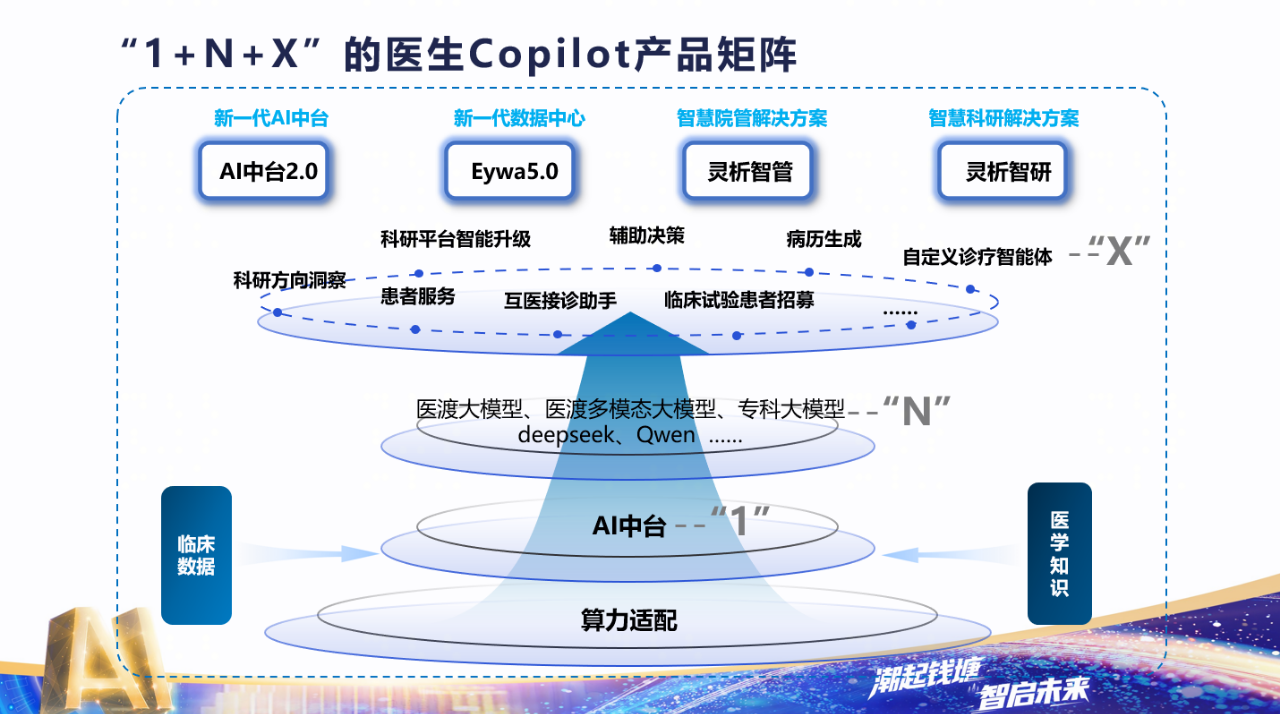 基于雙中臺(tái)架構(gòu),醫(yī)渡科技推出“1+N+X”的醫(yī)生Copilot產(chǎn)品矩陣——以自主可控的1個(gè)AI中臺(tái)為基座,集成N個(gè)大模型(包括DeepSeek、醫(yī)渡醫(yī)療垂域大模型等),賦能X個(gè)業(yè)務(wù)場(chǎng)景(覆蓋診前、診中、診后全流程)。